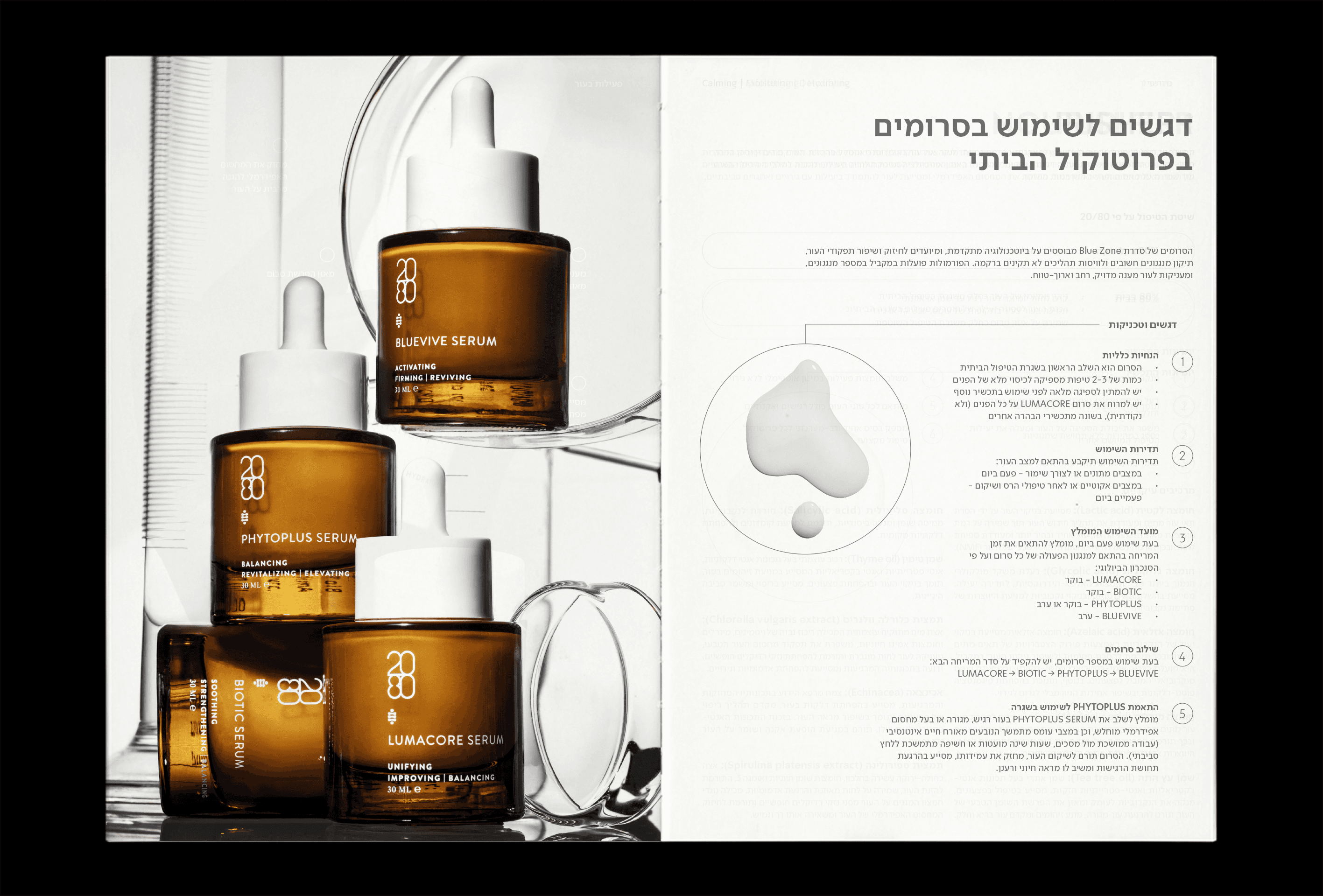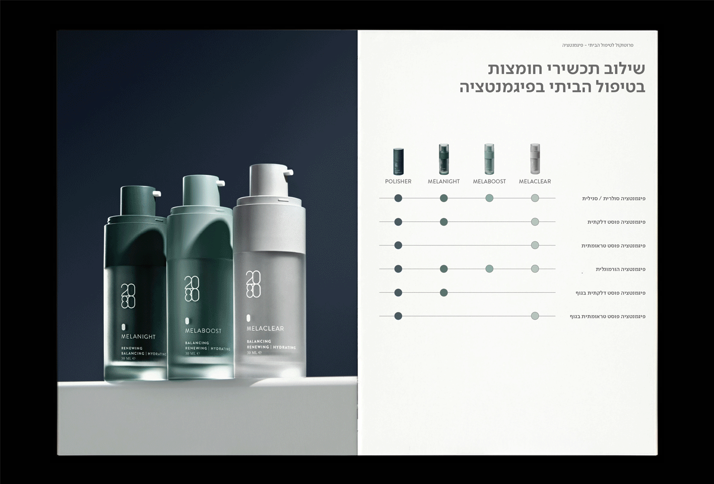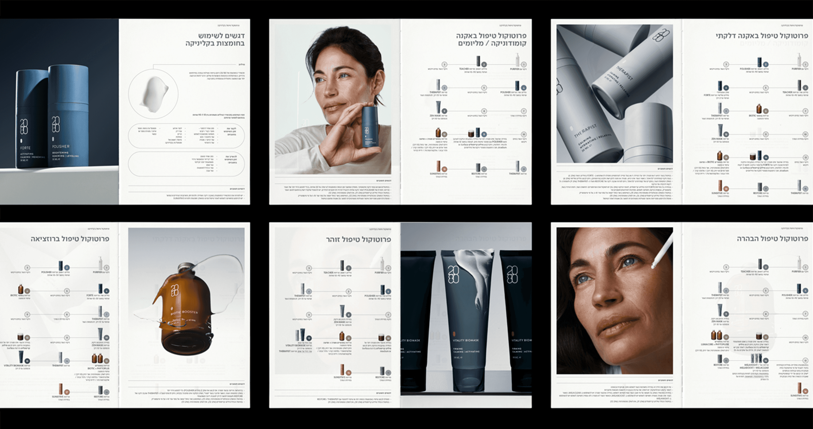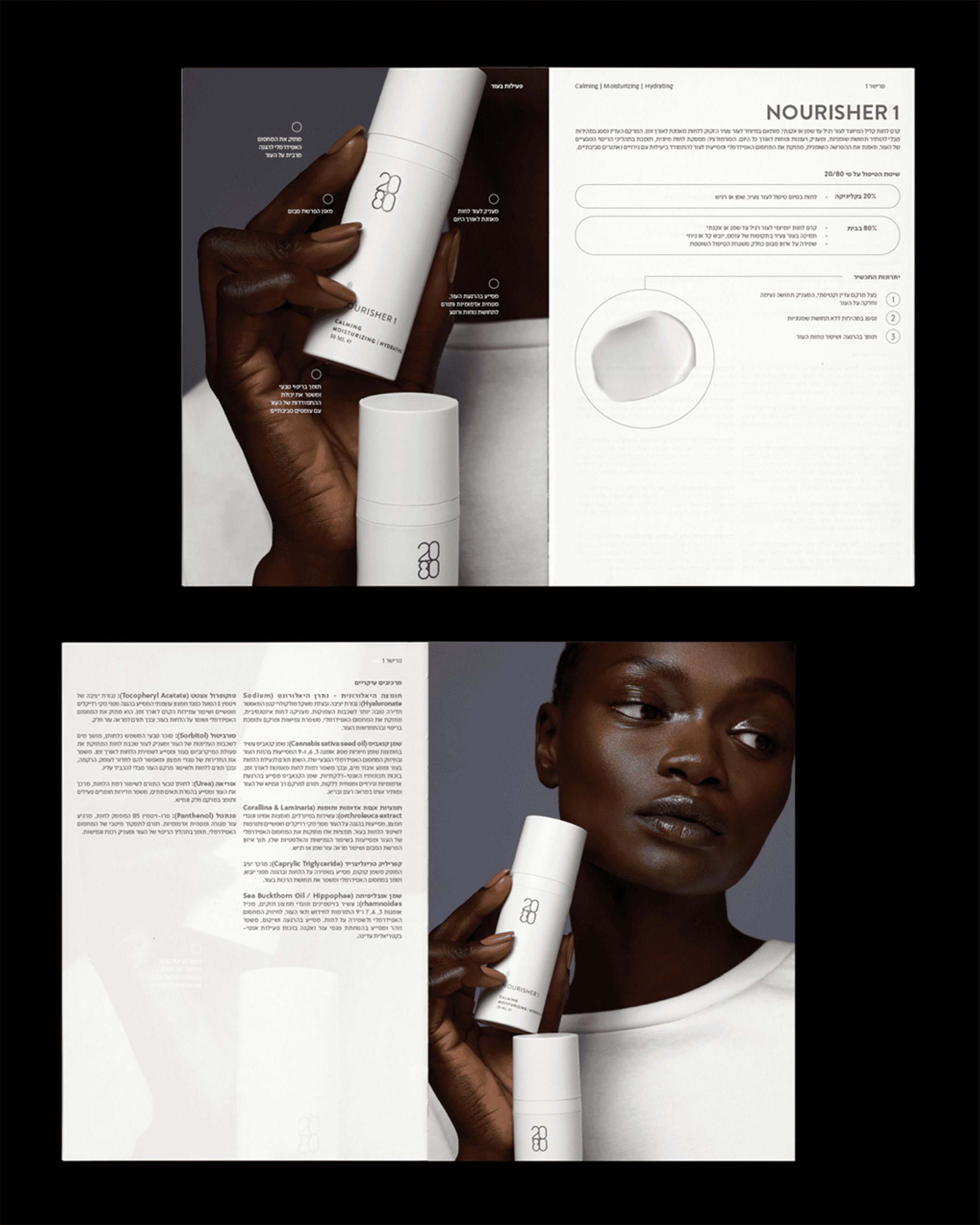 As part of my work at ARK Visual, under the creative direction of Hagar Erez, I contribute to the ongoing brand development of 2080 Skincare, a professional skincare brand focused on clinical treatments and home-care solutions. The work spans art direction, catalog and print design, website design, and social media, all crafted to reflect the brand’s clinical precision alongside a clear, approachable visual language. The resulting system balances professionalism with warmth, creating a cohesive identity across all touchpoints while supporting the brand’s protocol-driven philosophy. All rights reserved to Hagar Erez Ltd. Model photography: Tal Abudi. Product photography: Sivan Roshianu.